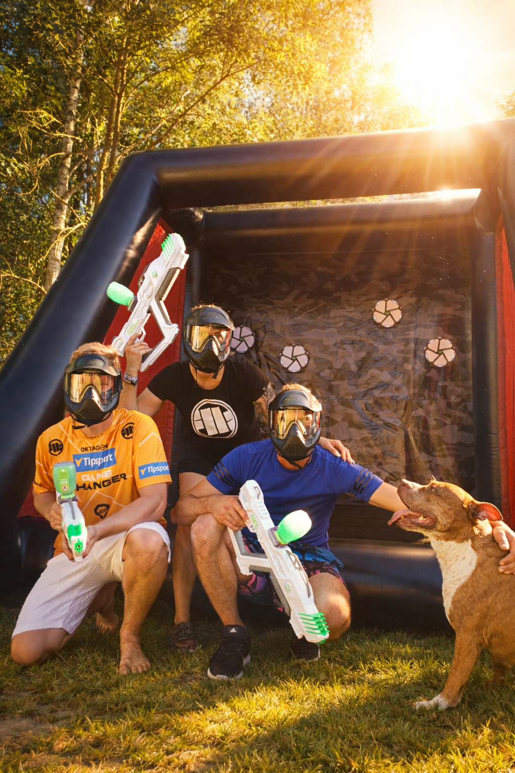 2️⃣ Im Garten – wir kommen zu dir und bauen ein Spielfeld mit aufblasbaren Strukturen, Gel Blastern und Schutzmasken auf.